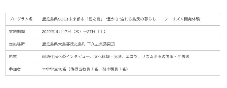 徳之島でのFSプログラムは2015年から開始し、昨年度は新型コロナウイルス感染拡大の影響により、同プログラムを10日間オンラインで実施しました。徳之島の集落に焦点を当て、地元住民へのインタビューを通して「島民の暮らし」「文化伝統」等の特徴を学び、徳之島の未来へ向けたメッセージや学生目線でのエコツーリズム企画を発表しました。