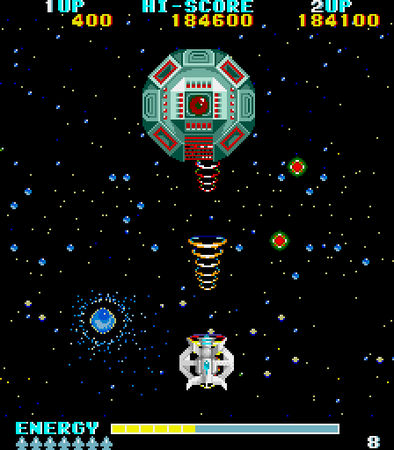 ゲームフィールドはAからZまでの25セクション構成。3セクションごとに巨大なボスが登場するほか、隕石を回避しながらドラム缶を取得するボーナスステージなどもあります。