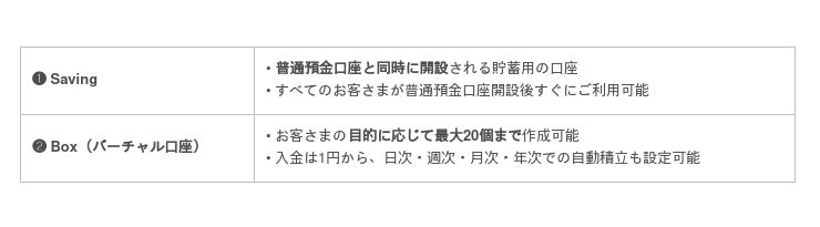 みんなの銀行では、普通預金の口座開設と同時に、貯蓄預金口座も開設されます。貯蓄預金口座には、自動で開設される口座「Saving」と後から作成するバーチャル口座「Box」があり、今回のキャンペーン対象となる残高、および適用金利は両方が対象です。なお、貯蓄預金は定期預金と異なりお金の出し入れは自由です(満期はございません)。また、「Box」は将来の目標に必要なお金や今月支払いに必要なお金など目的に応じて他のお金と分けて管理できる便利な口座です。今使わないお金を「Box」で便利に、かつ、お得に預けていただくことができます。