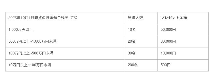2023年6月21日~2023年10月1日の間に、新たにみんなの銀行の預金口座(普通・貯蓄)へ合計10万円以上をご入金(ATM入金、他行からの振込・ことら送金)いただいたお客さまを対象に、2023年10月1日時点の貯蓄預金残高に応じて、抽選で総勢260名さまに以下のとおり現金をプレゼント