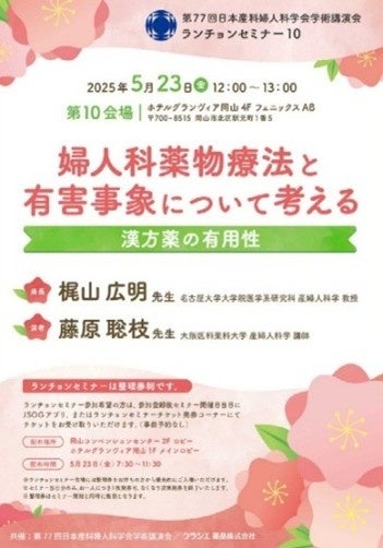 また、5月23日(金)には「婦人科薬物療法と有害事象について考える」をテーマにランチョンセミナーを共催します。名古屋大学大学院医学系研究科 産婦人科学の梶山教授を座長にお招きし、大阪医科薬科大学 産婦人科学の藤原先生と婦人科領域における漢方薬の有用性についてご講演いただきます。