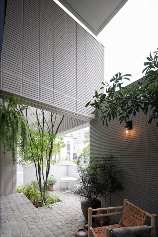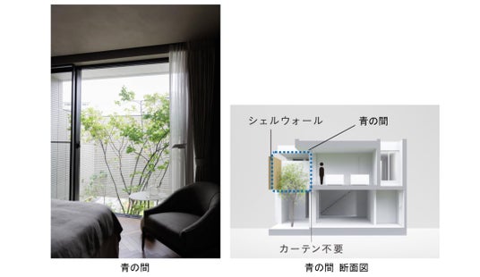 主寝室などの居室に設けた大開口の外側にシェルウォールで囲われた空間を設け、背の高い植栽と組み合わせた空間です。シェルウォールでプライバシーを確保しながら、大きな窓から緑を眺めることができます。「青の間」を設けることで、四季を感じながらくつろぐことができる豊かな空間を実現しています。