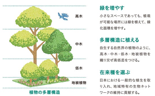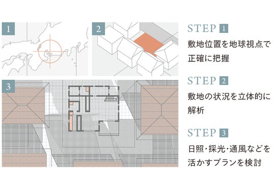 新たな提案となるシェルウォールに、「住環境シミュレーションシステムARIOS※1」と当社独自の植栽提案「まちもり※2」を組み合わせた、光・風・空・緑などの自然を効果的に暮らしに取り入れられる設計手法を採用しています。シェルウォールの配置や範囲を検討する際、邸別に室内の日照・日射・通風・採光などを科学的に検証しながら設計することで、外部の視線は遮りながらも光や風を取り入れられる住まいを実現することができます。また、シェルウォールで生み出した「間」に、在来種を中心とした階層構造の植栽を配置することで、殺風景になりがちな都市の住まいに小さな森を創出し、暮らしに緑や空を取り入れるとともに、鳥類をはじめとした都市の多様な生物が訪れる「エコロジカル・ネットワーク」の形成を促進します。