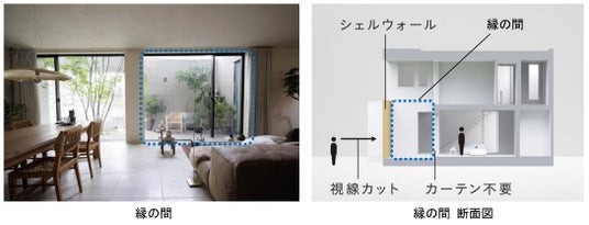 シェルウォールと屋根で囲われた新しい中間領域の提案。シェルウォールが外部からの視線を遮ることで、カーテンを開けてもプライバシーを守りながら寛ぐことができます。さらに「縁の間」は心地よい屋外の居場所となるとともにリビングの一部としても認識できるため、生活空間が大きく広がり暮らしを豊かにします。
