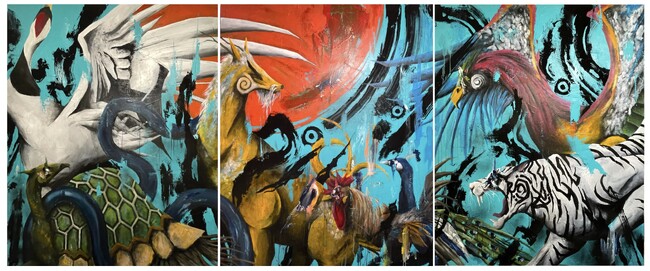 創作活動に一貫するテーマは「滲み出る生命」。3000年以上の歴史がある漢字に生命を感じ取り、溢れる感情や色彩を可視化するべく墨のみならずアクリル絵具を使う描法が特徴。言葉から立ち上がってくる風景を描いた作品に注目が集まっています。