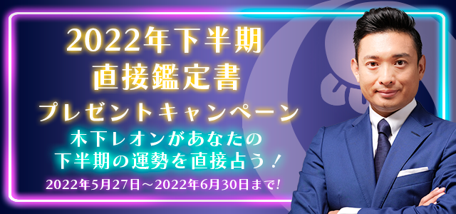 『木下レオンの占い』では「直接鑑定書プレゼントキャンペーン」が開催中!当キャンペーンでは、2022年の下半期の運勢を詳細に占えるキャンペーン対象鑑定を占った方から抽選で、木下レオンが直接占う鑑定書をプレゼントいたします。来る下半期、あなたに何が起こり、そしてどう過ごしたらよいのか…。あなたの下半期が幸せで溢れるものになるように木下レオンが占います。この機会にぜひ、「木下レオンの占い」をご利用ください。