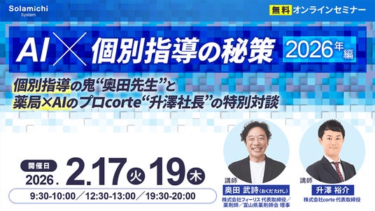 クラウド電子薬歴『CARADA 電子薬歴 Solamichi』の企画・開発・販売を行う株式会社ソラミチシステムは、無料オンラインセミナー「【AI×個別指導の秘策 2026年編】個別指導の鬼"奥田先生"と薬局×AIのプロcorte"升澤社長"の特別対談」を2月17日(火)、19日(木)に開催します。