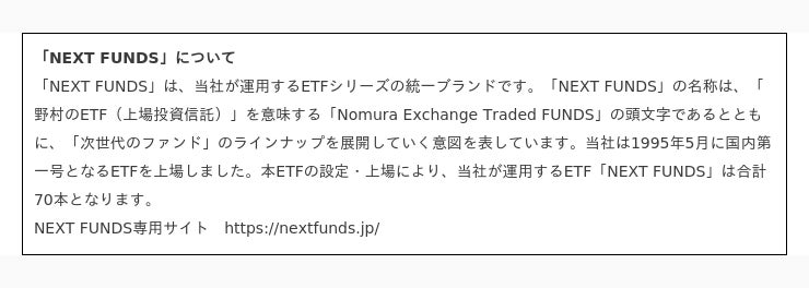 野村アセットマネジメント株式会社は、ETFについて、直接、投資者の皆さまのお申込みを承っておりません。ETFの投資にあたっては、取扱い第一種金融商品取引業者(証券会社)に口座を開設になり、お申込みください。