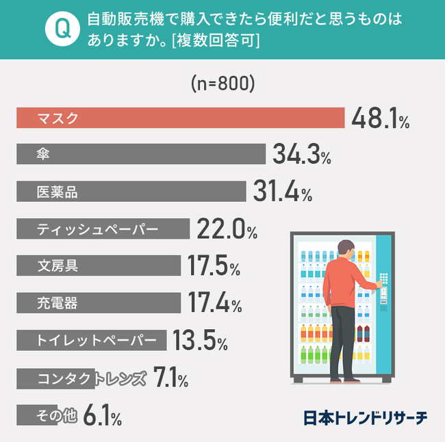 48.1%の方が、自動販売機で「マスク」を購入できたら便利だと思うと回答しました。