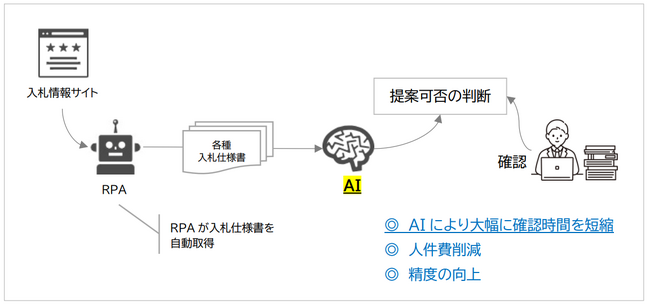 当研究では、書式や内容が異なる入札案件毎の仕様書を評価し、提案可否を自動で判断するAIを開発します。これにより担当者の提案可否の確認作業を大幅に短縮することが可能です。