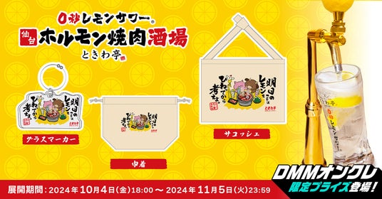 客席のテーブルにレモンサワーのタップが付いており、好きなタイミングで好きなだけレモンサワーを飲むことができる「0秒レモンサワー (R)仙台ホルモン焼肉酒場 ときわ亭」のDMMオンクレ限定コラボグッズを2024年10月4日(金)より期間限定で展開します。グラスマーカーやサコッシュなど、飲み会で活躍するグッズをご用意しました。
