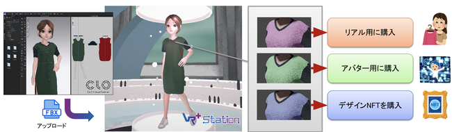 Vma plusが提供するメタバース「Vma plus Station」には、EC機能が搭載されています。これにより、ユーザーはメタバース内でアイテムをカスタマイズし、自分の好みの洋服を購入できるようになりました。また、アーティストのライブ中に使用された服飾品の販売や、メタバース上で展示されたデザインのリアル用、アバター用、またはNFTとしての販売が可能です。