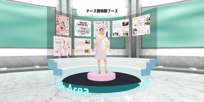 学生たちがデザインしたCLOの”3Dモデル”は、11月4日から5日にかけてメタバース特設会場に展示されました。参加者は遠隔地からでも服飾のリアルな質感や色合いを観察する事ができ、気に入ったデザインに投票をする企画では150票以上の投票がありました。さらに、仮想空間内のパネルには作成秘話や作品紹介が掲載され、学生が以前に製作した医療従事者ユニフォームも同時に展示されました。