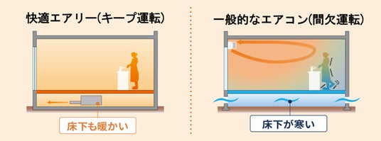 「快適エアリー」は家全体で空調をコントロールし、一年じゅう快適な室内を実現する当社独自の第一種換気・全室空調システムであり、床下空間を暖めることで足元からあたたかい「床あったか」機能が特長です。