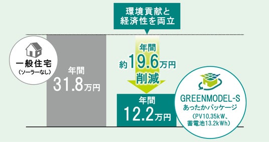 これらのスマートシステムにより、モデルプランでの消費電力量のうち夏季(5~10月)では電力会社から購入が必要な電気はわずか15%(エネルギー自給自足率85%)と試算、PV容量拡大前と比べ5%向上しました(※9)。年間光熱費は、PV、蓄電池を設置しない住宅と比較して約19.6万円(※9)削減することが可能で、環境貢献と経済性の両立を実現します。