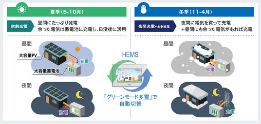 季節によって蓄電池の運転モードを自動で切り替える「グリーンモード多雪」機能