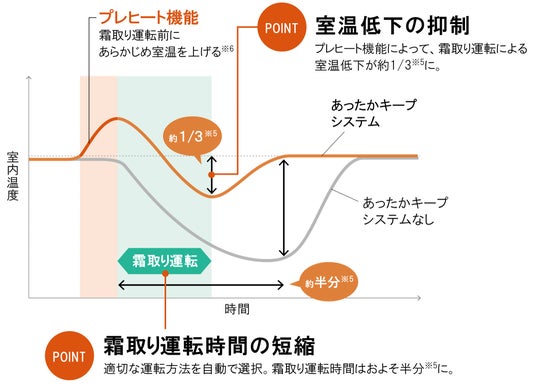 快適エアリー「あったかキープシステム」における霜取り運転中の室内温度イメージ