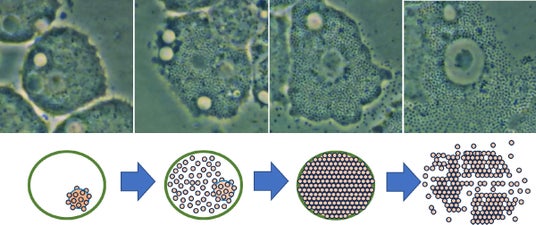 今回、このミミウイルスが宿主であるアカントアメーバの細胞内で増殖して放出されるまでの様子を動画で連続的に撮影することに世界で初めて成功しました。