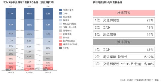 当社にて実施した「不動産施策に関するアンケート調査(24-Q3)」によると、オフィス移転先を選定する際に重視する条件は、 「交通利便性」が最も多く、「コスト」、「周辺環境」が続いた。交通利便性の回答割合は上昇傾向となっており、オフィス選定時に交通利便性を重視する傾向が強まっている。一方で、引き続き「コスト」の占める割合は高いものの、本調査を開始した2022年Q3以降、回答割合は低下傾向となっている。また、オフィス移転時の面積動向別に見ると、減床移転においては「交通利便性」よりも、「コスト」を重視する傾向が見受けられた。