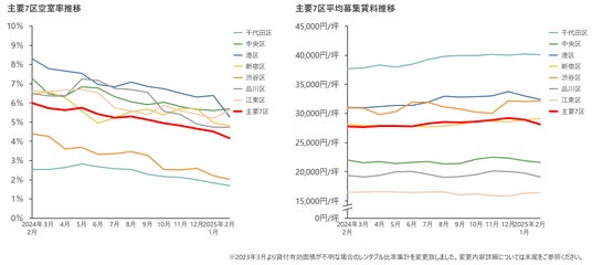 三菱地所リアルエステートサービス株式会社(本社:東京都千代田区大手町1-9-2、代表取締役社⾧:湯浅哲生)は、2025年2月末時点の東京主要7区(千代田区、中央区、港区、新宿区、渋谷区、品川区、江東区)の大規模オフィスビル※1の空室率・平均募集賃料調査を実施し、この度、調査結果がまとまりましたので、お知らせします。