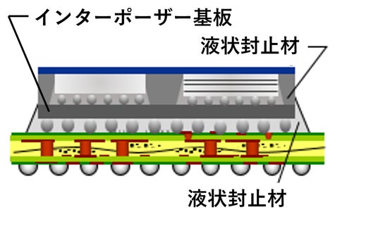 近年、AI技術の進化に伴い、高速な演算処理を行うプロセッサや、大容量のデータを即時に処理できる半導体メモリが求められています。これらの要求に応えるため、先端半導体パッケージは、機能の異なるチップを混載したり、複数のチップを3次元積層したりすることで、電子信号のやり取りをより高速で効率的に行っています。このような先端半導体パッケージのチップやインターポーザー基板(*1)は、小さな突起状の電極端子(バンプ)を介してパッケージ基板と接続されていますが、その間には隙間が生じます。液状封止材は、その隙間(ギャップ)を充填することで、温度や湿度の影響や機械的な外力から半導体パッケージを保護しています。