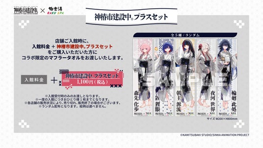 店舗ご入館時に、入館料金+神椿市建設中。プラスセットの料金をお支払いいただいた方に、描き下ろしイラストを使用したコラボ限定マフラータオルをお渡しします。(全5種ランダム)