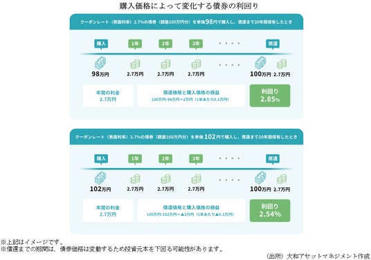 利回りは、債券の購入価格とクーポンレート(表面利率)によって決まります。同じ債券でも額面(100円)より高く購入すると、100円で償還されるため利回りは低くなり、額面(100円)より安く購入すると利回りは高くなります。ファンド購入時には、投資対象債券の利回りが重要な指標となるので、詳細は特集ページ上部をご参照ください。