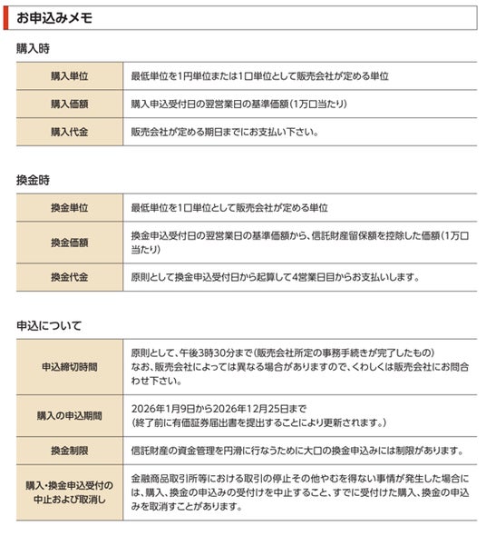 - 投資信託は値動きのある有価証券等に投資しますので、基準価額は大きく変動します。したがって、投資元本が保証されているものではありません。信託財産に生じた利益および損失はすべて投資者に帰属します。投資信託は預貯金とは異なります。