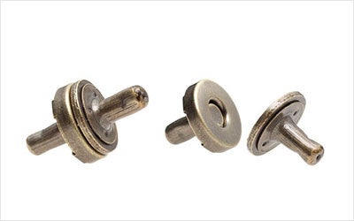 KSR10、KSR8の小カシメは、足がスポット溶接のため接合部の厚みが極めて小さく、従来品よりもぴったり生地に固定でき、取り付けの自由度が大幅に向上しました。傘や手帳など今までスナップボタンを使っていたものなどへ高級感の付加価値を付けるなど、幅広い用途にお使いいただけます。