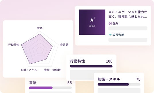 候補者の回答内容をもとにした評価もAIが行いレポートを出力します。評価は、複数の基準・項目について、AIとの対話を通じたデータソースに基づき公平かつ客観的に行われます。そしてその結果が可視化されることにより、評価の属人化やバラつきを防ぎ、一貫性と納得感のある判断を行うことが可能となります。