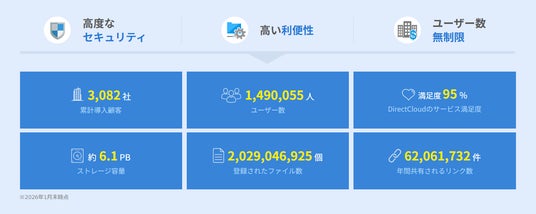 インテリジェンスをシンプルに共有する株式会社ダイレクトクラウド(本社:東京都港区、代表取締役:安 貞善、以下ダイレクトクラウド)は、2026年1月末時点で累計導入社数3,000社を突破しました。2024年時点の2,500社から約16%増、2025年11月の2,900社からも拡大を続けており、ユーザー数は120万人から140万人へと約17%増加しています。現在はデイリー1,000万件以上のデータ処理を行い、企業間のファイル共有を支えるクラウド基盤として活用されています。