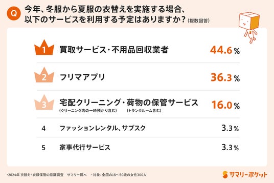 「今年、冬服から夏服の衣替えを実施する場合の利用サービス」について尋ねると、最も利用予定があるものは買取サービスや不用品回収(44.6%)、フリマアプリ(36.3%)、次いで宅配クリーニングや荷物の保管サービス(16.0%)という結果になりました。