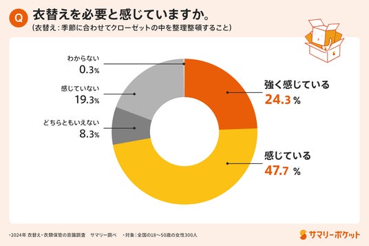 株式会社サマリー(本社:東京都千代田区、代表取締役:日下部康介)が運営する、宅配収納サービス「サマリーポケット」では、荷物の収納・管理に関する市場調査を定期的に行っており、この度「衣替え・衣類保管に関する調査」を全国の18~50歳の女性300名を対象に実施しました。