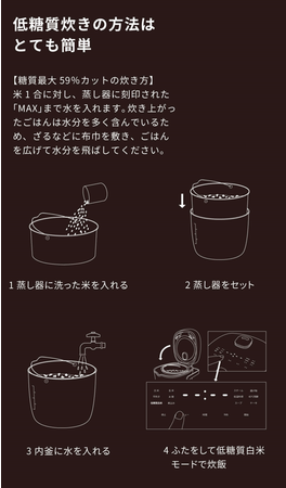 加熱することで溶け出した糖質は蒸し器の下に排出し、仕上げに高温の蒸気でふっくら蒸すからおいしく炊きあがります。