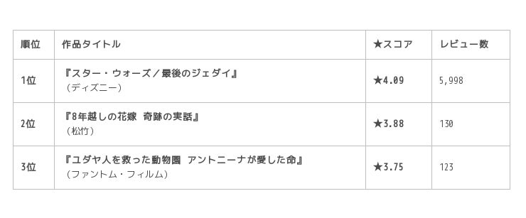※本ランキングは公開日から12月17日までの★スコアが3.0以上の作品を対象としています。