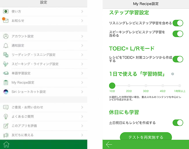 1. 設定メニューの「My Recipe設定」メニューをタップして選択し、 「TOEIC(R)︎ L/Rモード」をタップして選択してください。 その後、「テストを再実施する」をタップして選択して下さい。