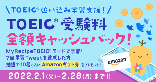 株式会社ポリグロッツ(本社:東京都新宿区、代表取締役:山口隼也)は、英語学習アプリ レシピー にて MyRecipe TOEIC(R)︎ モードで学習しているお客様を対象に、抽選で10名の方にTOEIC(R)︎受験料相当額のAmazonギフト券( TOEIC Listening & Reading Testの受験料の¥6,490円)をプレゼント致します。