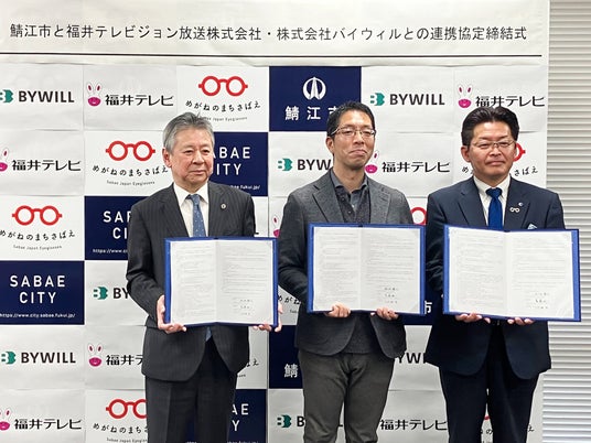 日本全国47都道府県のカーボンニュートラル実現を目指す株式会社バイウィル(本社:東京都中央区、代表取締役CEO:下村 雄一郎、以下「バイウィル」)は、福井テレビジョン放送株式会社(本社:福井県福井市、代表取締役社長:酒井 美樹男、以下「福井テレビ」)とともに、福井県鯖江市(市長:佐々木 勝久、以下「鯖江市」)との連携協定を締結しました。本協定をもとに、J-クレジット(*1)をはじめとした環境価値に関する情報を共有し、さらに新たなビジネスモデルの開発など事業の推進を通じて連携を強化することで、鯖江市におけるカーボンニュートラルの実現に貢献します。