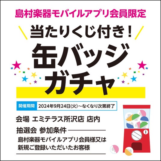 島村楽器モバイルアプリ会員様または新規ご登録いただいたお客様は、缶バッチ入りガチャガチャにご参加いただけます。