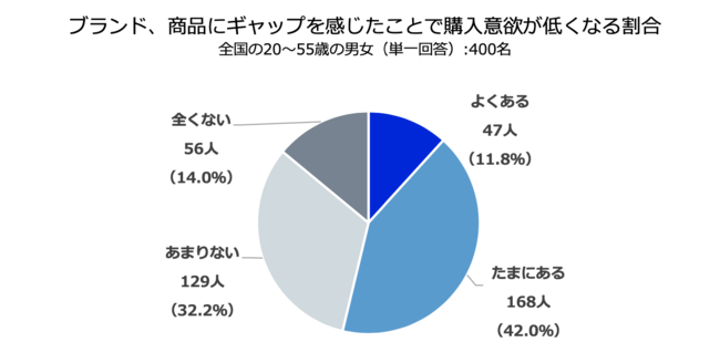 ・以前実施したD2C商品購入頻度が高い消費者に聞いた「D2C商品の購入におけるブランド体験に関する意識調査」では、一度商品を購入したことがあっても、それ以降で商品やブランドのイメージにギャップを感じると、次からは買わないと思った経験に関しては「よくある(11.8%)」「たまにある(42.0%)」で全体の53.8%。
