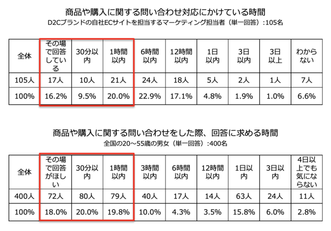 ・以前実施したD2C商品購入頻度が高い消費者に聞いた「D2C商品の購入におけるブランド体験に関する意識調査」では、商品や購入に関する問い合わせをした際、回答に求める時間を聞いたところ、最も多かった回答は「30分以内(20.0%)」で、「その場で回答がほしい(18.0%)」と即時の対応を求める声も多かった。1時間以内と回答した人は19.8%で合計すると57.8%の人が問い合わせてからすぐに回答を求めていることが分かった。