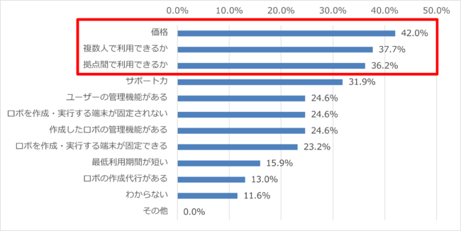 3.中小企業で有料版のRPAを導入している企業のうち、導入する際に重視したことは、1位「価格」(42.0%)2位「複数人で利用できるか」(37.7%)、3位「拠点間で利用できるか」(36.2%)