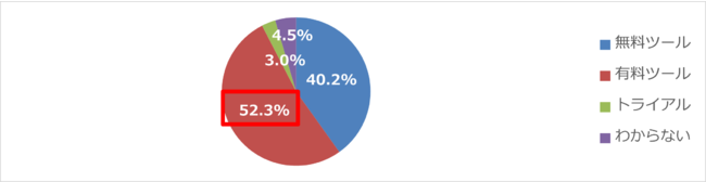 <結果2.>「有料版」の回答は52.3%(69人)、「無料版」は40.2%(53人)、「トライアル」が3.0%(4人)、