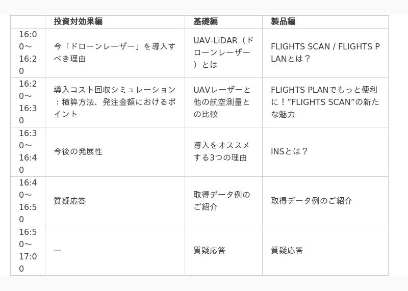 今回のウェビナーは、建設コンサルタント、測量事業者さまにむけて開催されます。企業・団体の規模、ドローンやその他のレーザー機器の保有状況は問いません。業種や役職も不問。少しでもドローンレーザー測量に関心があり、ご都合の合う方は奮ってご参加ください。