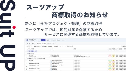 株式会社スーツ(所在地:東京都千代田区、代表取締役社長CEO:小松 裕介)は、チームでかんたん、毎日続けられるプロジェクト・タスク管理ツールの経営支援クラウド「Suit UP」(スーツアップ)に関連する「全社プロジェクト管理」の商標取得について、お知らせいたします。
