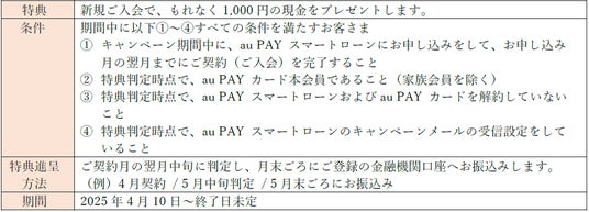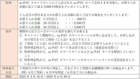 au PAY カードは2024年12月に1,000万会員を突破し、2025年4月9日まで開催しておりました「au PAY カード会員限定 入会するだけでもれなく1,000Pontaポイント進呈」キャンペーンも大変ご好評いただきました。au PAY カード会員の皆さまによりおトクにau PAY スマートローンをご利用いただくため、本キャンペーンでは、さらに特典を充実させています。おトクなキャンペーンを通じて、au PAY カードをお持ちのお客さまにとって最も身近なローンとして、au PAY スマートローンの利便性を実感していただけることを目指しています。