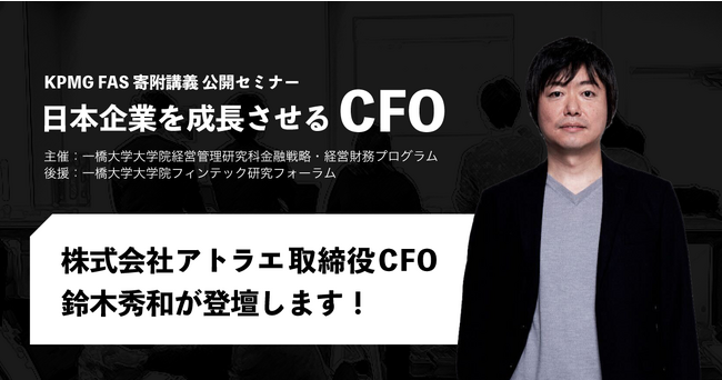 People Tech (テクノロジーによって人の可能性を拡げる) 事業を展開する株式会社アトラエ(本社:東京都港区、 代表:新居佳英、東京証券取引所プライム市場:6194、以下 アトラエ) は、取締役CFO 鈴木秀和が、KPMG FAS寄附講義公開セミナー「日本企業を成長させる CFO」 に登壇することをお知らせいたします。