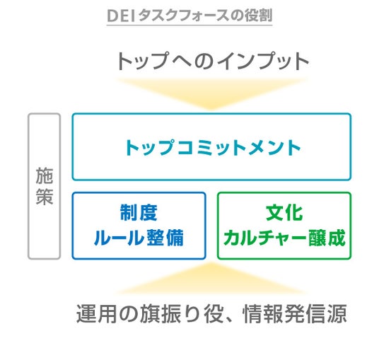 なお、2023年6月にはグループ社員により構成されるDEIタスクフォースを設置し、「トップコミットメント」の下、「制度・ルール整備」「文化・カルチャー醸成」の両輪で施策の検討・実施を継続しています。