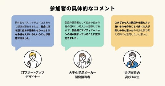 - 「さまざまな人の観点から最も良いものを作ることで、多くの人が楽しめると思い、文化祭で考える時にも活用したいと思った。」(高校生)