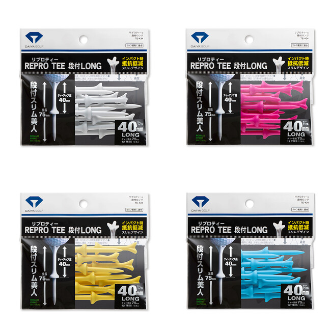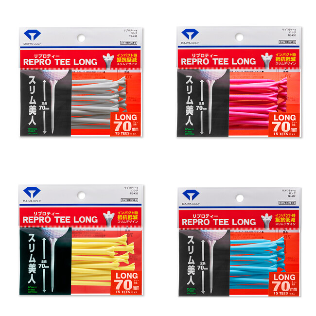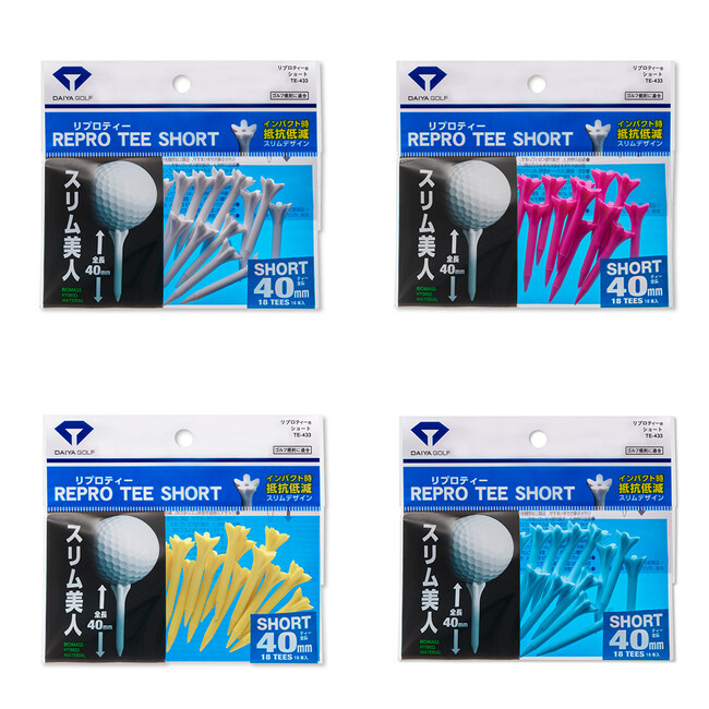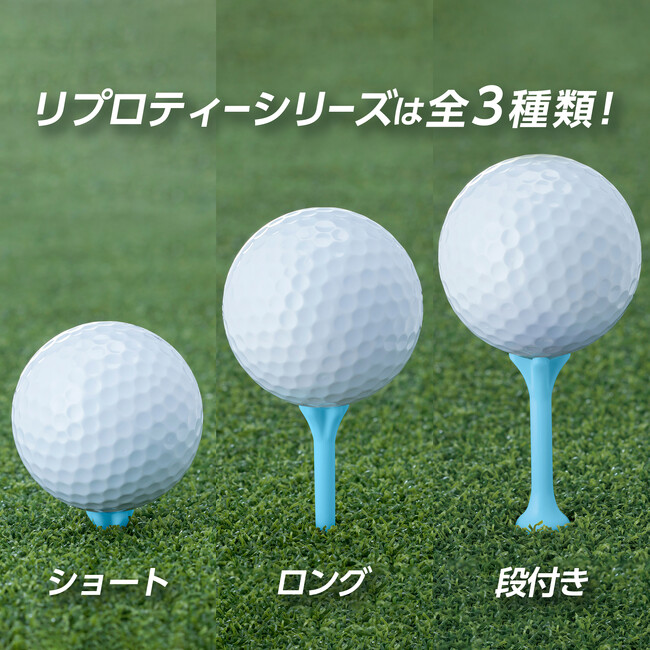 『リプロティー』は、ロング、段付きロング、ショートと3種類のサイズがあるため、ショットに合わせてティーを選べます。これまでのホワイト・ピンク・イエローに加え、今回の新色ブルーの追加により、4色3タイプ全12商品から選べるようになりました。
